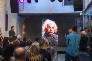 Otwarcie FabLabu uświetnił sam Albert Einsten, zaskakując swą obecnością pozostałych gości. – Nie trzeba zaczynać wielkiego biznesu w wielkich halach, wystarczy miejsce, gdzie można eksperymentować, uczyć się i budować prototypy. Takim miejscem jest właśnie FabLab, współczesny garaż innowacji – zauważył. Choć jego słowa brzmiały autentycznie, obecność Einsteina była jedynie wytworem sztucznej inteligencji. Pomysł na wykorzystanie wirtualnej wersji genialnego fizyka narodził się w zespole kreatywnym FabLabu, który chciał w symboliczny sposób podkreślić ideę łączenia nauki, technologii i wyobraźni – fundamentów, na których opiera się działalność tej innowacyjnej przestrzeni.