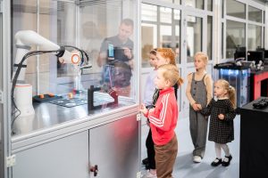 Podczas wydarzenia goście mieli okazję zajrzeć do wnętrza laboratorium i samodzielnie przetestować pięć interaktywnych stacji technologicznych. Na stanowisku druku 3D na ich oczach powstawały gadżety, a w strefie robotyki ramię robotyczne sprawnie reagowało na komendy, prezentując precyzję i możliwości automatyzacji. Eko-projekty połączone z pokazem szycia i haftu promowały ideę upcyklingu. Elektronika i IoT przyciągały uwagę demonstracją sterowania światłem oraz prezentacją drona w akcji. Całość dopełniała strefa Design Thinking – interaktywna ściana pomysłów, na której uczestnicy mogli zostawić własne inspiracje i rozwiązania.