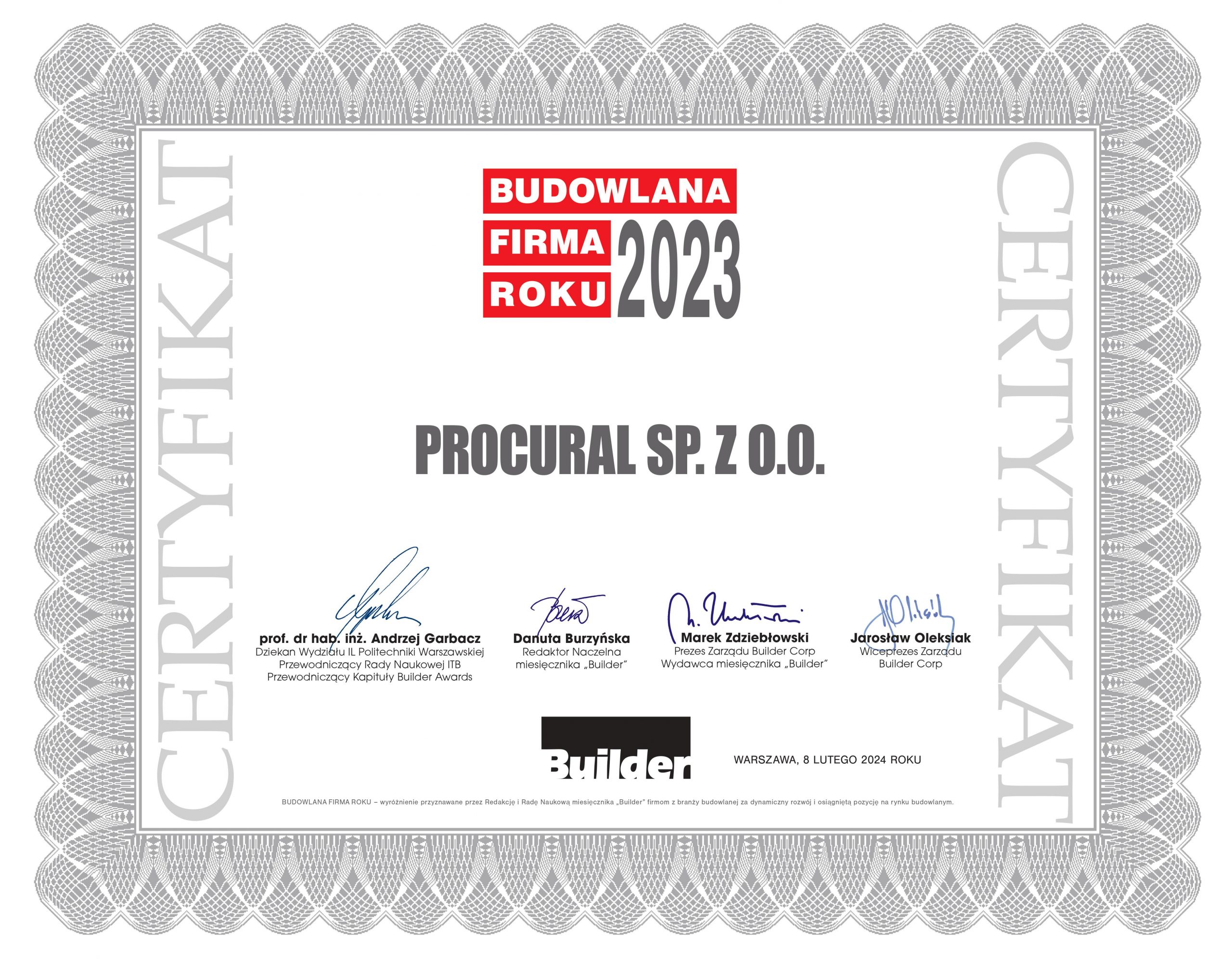 Firma PROCURAL (dawniej Ponzio Polska) otrzymała wyróżnienie przyznawane przez Redakcję i Radę Naukową miesięcznika „Builder” firmom z branży budowlanej za dynamiczny rozwój i wysoką pozycję na rynku budowlanym. Podczas Gali Builder Awards przedstawiciele spółki odebrali zaszczytne wyróżnienia – jako wyraz uznania, jakim firma cieszy się w środowisku budowlanym.