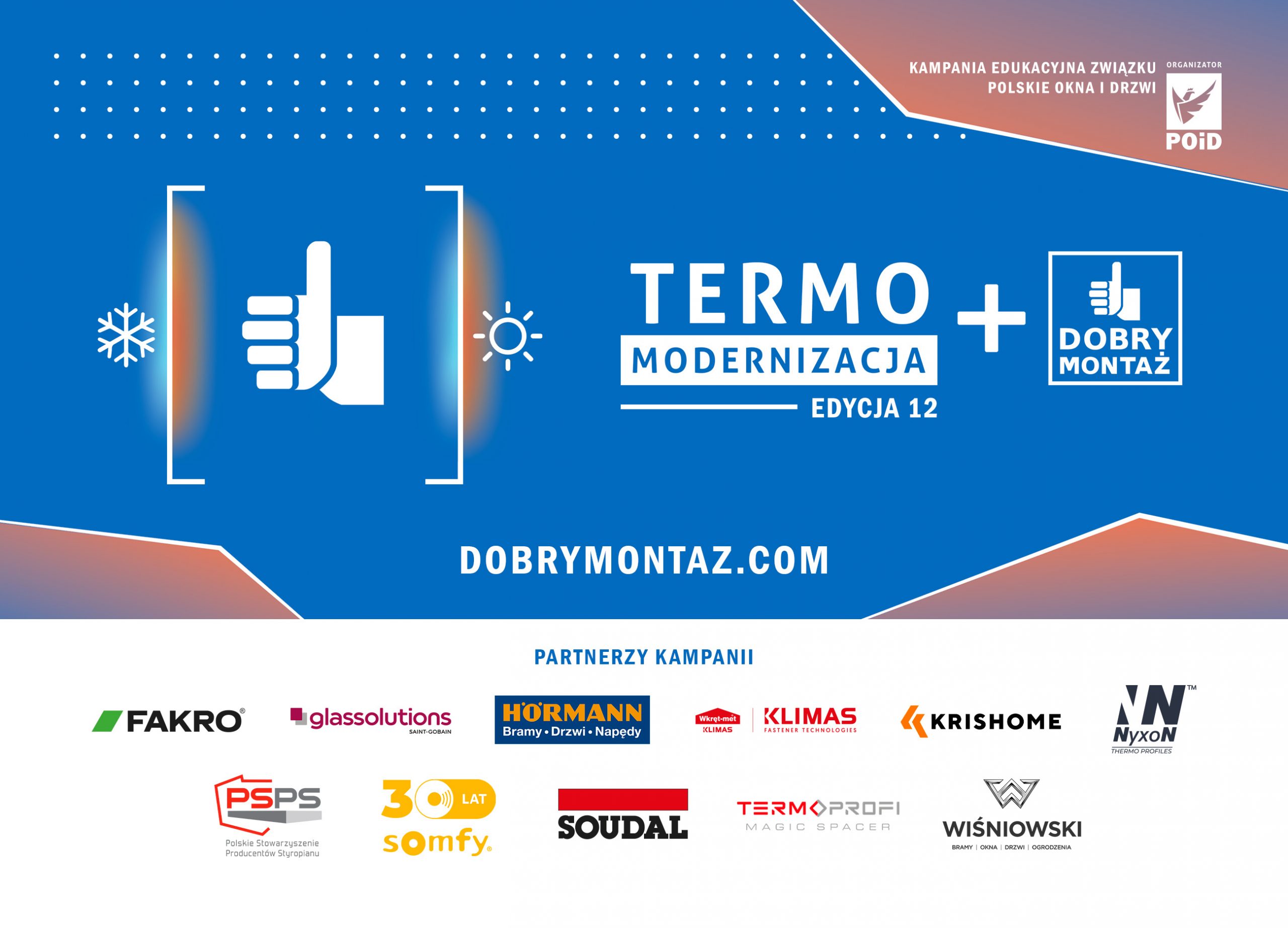 Partnerzy nowej edycji kampanii „TERMOMODERNIZACJA+DOBRY MONTAŻ”: FAKRO, GLASSOLUTIONS, HÖRMANN, KLIMAS WKRĘT-MET, KRISHOME, NYXON, POLSKIE STOWARZYSZENIE PRODUCENTÓW STYROPIANU, SOMFY, SOUDAL, TERMOPROFI, WIŚNIOWSKI.