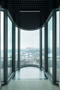 Centralnym elementem wieży jest przeszklony taras widokowy, częściowo osłaniający przed niekorzystnymi warunkami atmosferycznymi. Takie rozwiązanie umożliwia korzystanie z wieży przez cały rok, także przy wietrze czy niskich temperaturach, bez rezygnacji z bezpośredniego kontaktu z przestrzenią.
