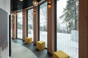 W jednym, szczególnie eksponowanym miejscu, charakterystycznym wykuszu, architekt zdecydował się jednak na zastosowanie wielkoformatowej szyby giętej. Czesław Matląg podkreśla, że to rozwiązanie unikatowe w skali tego typu obiektów: – Realizowana na zamówienie, gięta i zespolona formatka szkła tworzy wrażenie szklanej kopuły zawieszonej nad stokiem, potęgując poczucie lekkości konstrukcji.