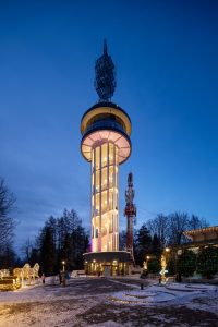 Lokalizacja wieży w samym sercu historycznego Parku Zdrojowego na Górze Parkowej wymagała szczególnej wrażliwości projektowej. Nowa dominantą nie miała zdominować otoczenia, lecz stać się jego naturalnym dopełnieniem. Stąd decyzja o szerokim zastosowaniu przeszkleń, które wizualnie „znikają” w pejzażu, oferując jednocześnie panoramiczny widok 360° na Krynicę-Zdrój, Beskid Sądecki, a nawet Tatry.