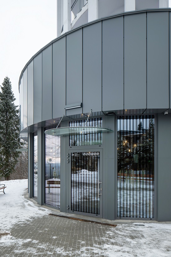 W jednym, szczególnie eksponowanym miejscu, charakterystycznym wykuszu, architekt zdecydował się jednak na zastosowanie wielkoformatowej szyby giętej. Czesław Matląg podkreśla, że to rozwiązanie unikatowe w skali tego typu obiektów: – Realizowana na zamówienie, gięta i zespolona formatka szkła tworzy wrażenie szklanej kopuły zawieszonej nad stokiem, potęgując poczucie lekkości konstrukcji.