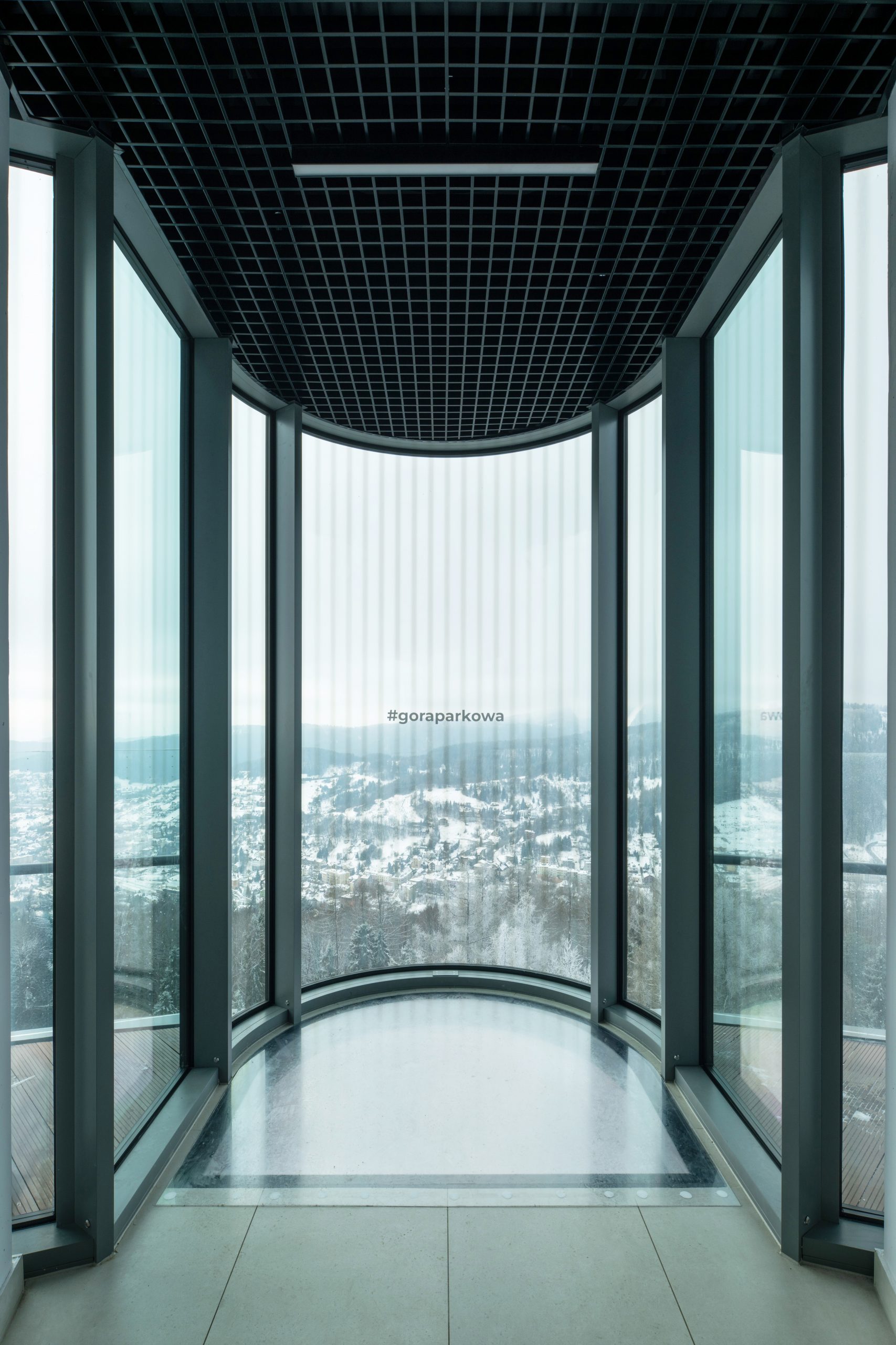 Lokalizacja wieży w samym sercu historycznego Parku Zdrojowego na Górze Parkowej wymagała szczególnej wrażliwości projektowej. Nowa dominantą nie miała zdominować otoczenia, lecz stać się jego naturalnym dopełnieniem. Stąd decyzja o szerokim zastosowaniu przeszkleń, które wizualnie „znikają” w pejzażu, oferując jednocześnie panoramiczny widok 360° na Krynicę-Zdrój, Beskid Sądecki, a nawet Tatry.