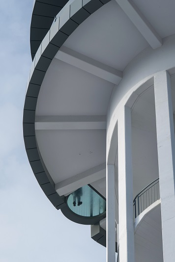 Jednym z największych wyzwań technicznych projektu była realizacja górnej partii fasady, zaprojektowanej na planie koła. – Zamiast typowych w takich przypadkach szyb giętych na całym obwodzie, zastosowaliśmy system słupowo-ryglowy oparty na prostych modułach. Odpowiednio dobrane profile kątowe, uszczelki oraz tolerancje montażowe pozwoliły uzyskać efekt płynnej, lekkiej bryły, bez wizualnych podziałów zakłócających odbiór architektury – wyjaśnia Czesław Matląg, dyrektor sprzedaży i obsługi inwestycji WIŚNIOWSKI.