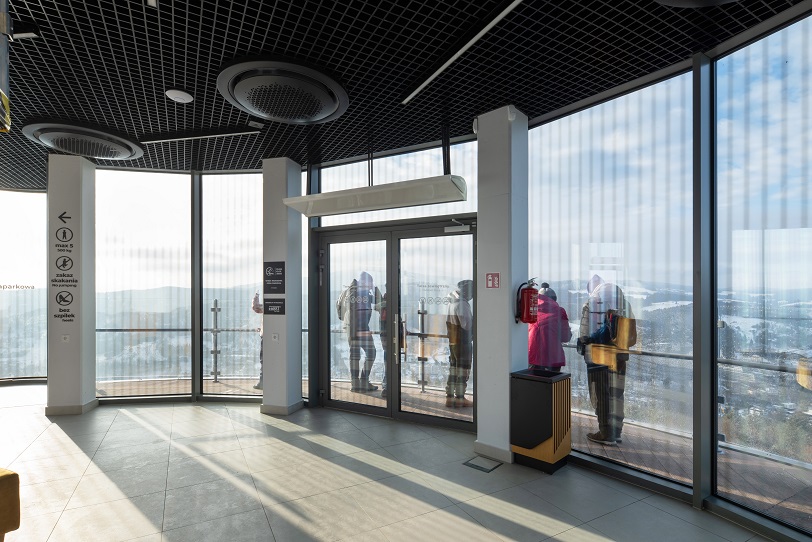 Choć drzwi i witryny w obiektach turystycznych często traktowane są jako element „standardowy”, w przypadku wieży na Górze Parkowej również one zostały dopasowane do specyfiki miejsca. Zastosowano systemy aluminiowe o podwyższonej izolacyjności, wyposażone w automatykę drzwiową, kontrolę dostępu oraz okucia umożliwiające bezpieczne użytkowanie przy dużym natężeniu ruchu. To rozwiązania, które dla użytkownika końcowego przekładają się na komfort i intuicyjność poruszania się po obiekcie.