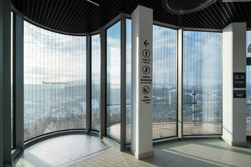 Wszystkie przeszklenia zewnętrzne wykonano z wykorzystaniem szkła typu AviSafe z powłoką przeciwsłoneczną. Rozwiązanie to ogranicza nagrzewanie wnętrza i poprawia komfort użytkowników, jednocześnie pełniąc funkcję ochrony ptaków. Subtelny wzór widoczny dla ptasiego wzroku pozostaje niemal niewidoczny dla człowieka, nie zakłócając odbioru panoramy z wieży widokowej. W obiekcie zlokalizowanym w zielonym sercu uzdrowiska taki aspekt środowiskowy miał znaczenie nie mniejsze niż parametry techniczne.