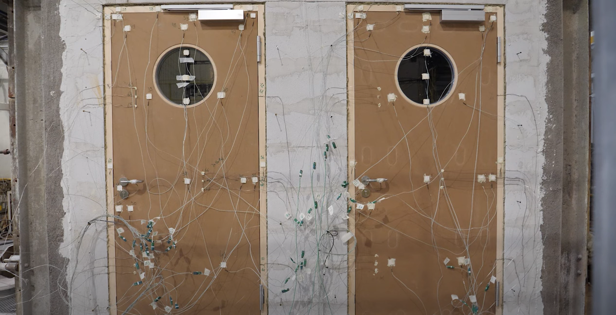 Jedne drzwi, wykonane z wysokiej jakości materiałów pęczniejących, były odporne na ogień przez ponad 90 minut, podczas gdy drugie, z niższej jakości szkła ognioodpornego i materiałów pęczniejących nie przeszły testu.