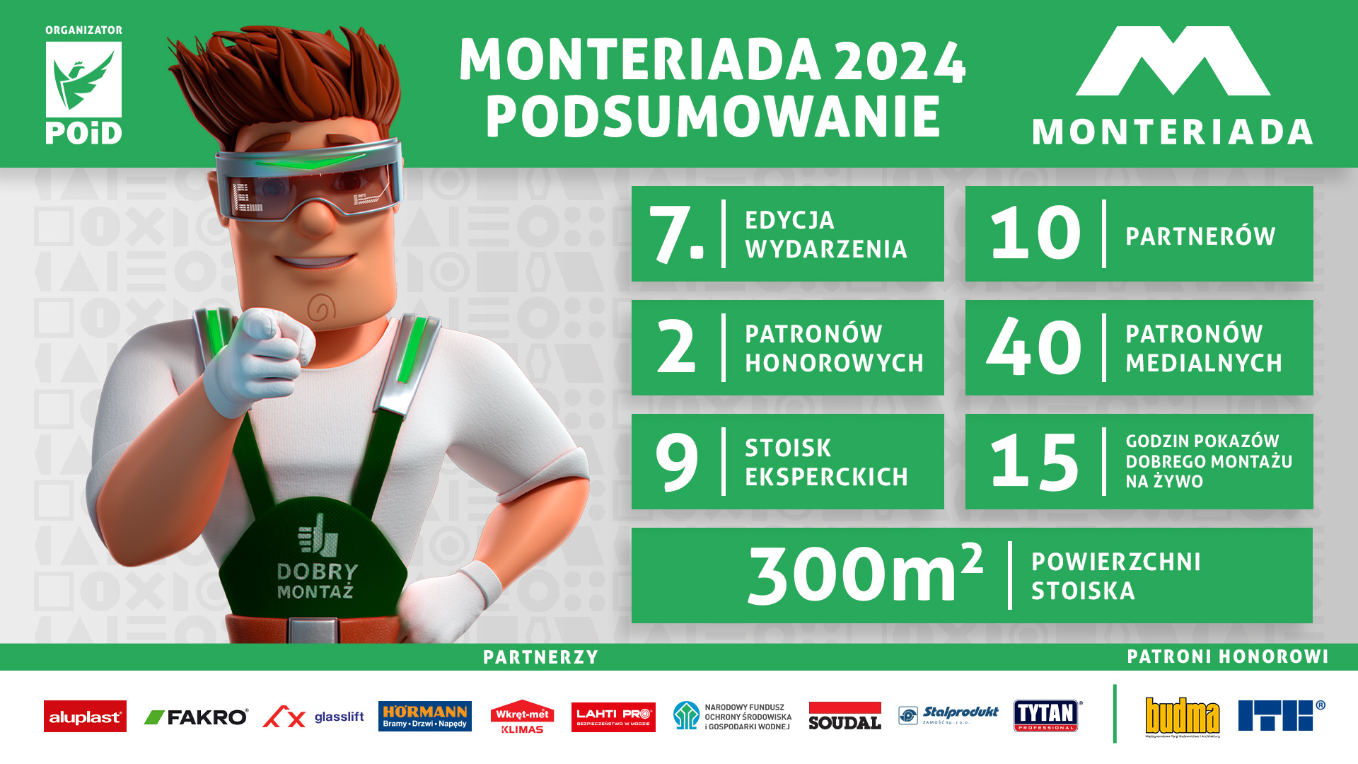 Patroni medialni MONTERIADY 2024: Bramy 21.pl, Budnet.pl, Budowa.org, Budowlanematerialy.eu, Budownictwo.co, Budownictwo.org, Budownictwob2b.pl, Budujemy Dom, Dom Idealny, Domszytynamiare.pl, Drzw21.pl, E-izolacje.pl, Ekobudowanie.pl, Ekspert Budowlany, E-okna.pl, Forum Branżowe, Inwestycje.plus, Izolacje, Kb.pl, Kupdom.com.pl, Ładny Dom, Ladnydom.pl, Materiały Budowlane, Monter Stolarki, Murator, Muratorplus.pl, Obud.pl, Okna21.pl, Okno Kwartalnik, Oknonet.pl, Przegląd Budowlany, RBT Magazyn, Regiodom.pl, Stolarkabudowlana.eu, Stolarstwo.org, Świat Aluminium, Świat Szkła, Teraz-srodowisko.pl, Termomodernizacja.pl, Wybudujemy.com.pl