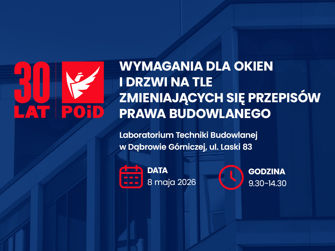 Związek POiD zaprasza na szkolenie: „Wymagania dla okien i drzwi na tle zmieniających się przepisów prawa budowlanego”, które odbędzie się 8 maja br., w Laboratorium Techniki Budowlanej w Dąbrowie Górniczej.