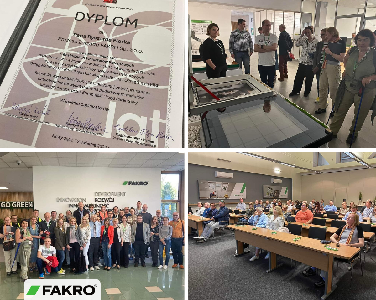 W ramach I. Beskidzkich Warsztatów Patentowych organizowanych przez Okręg Małopolski, Okręg Dolnośląski i Okręg Śląski Polskiej Izby Rzeczników Patentowych w siedzibie FAKRO odbyło się spotkanie połączone z panelami, wykładami oraz zwiedzaniem zakładu dla przybyłych gości, którymi byli Rzecznicy Patentowi z całej Polski. Głównym tematem warsztatów były zagadnienia dotyczące oceny przesłanek zdolności patentowej wynalazków w praktyce Europejskiego Urzędu Patentowego.