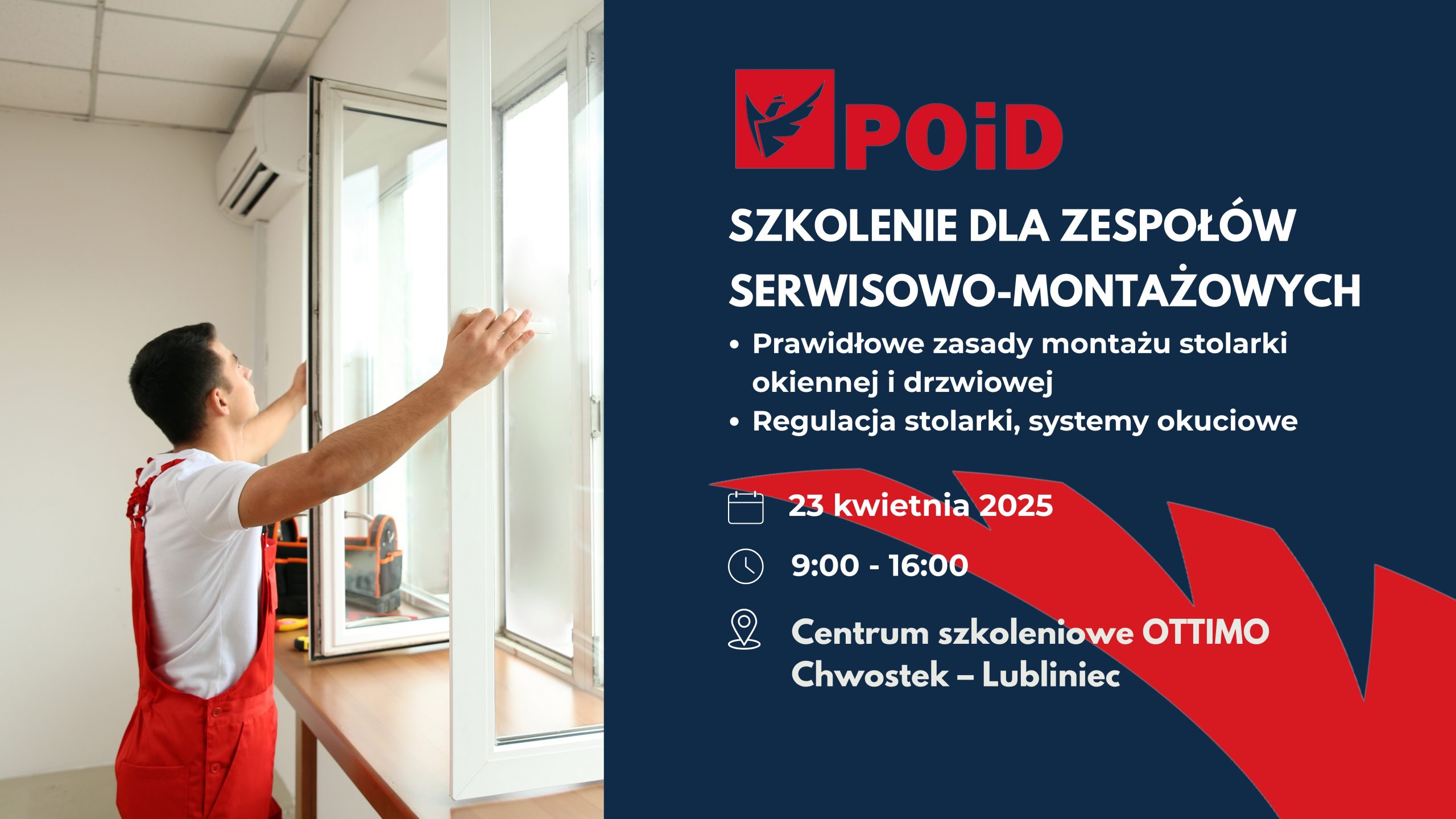 Z przyjemnością zapraszamy na specjalistyczne szkolenie pt. „Prawidłowe zasady montażu stolarki okiennej i drzwiowej” oraz „Regulacja stolarki, systemy okuciowe”, które odbędzie się 23 kwietnia 2025 roku w Centrum Szkoleniowym Firmy OTTIMO w Chwostku, Lubliniec.