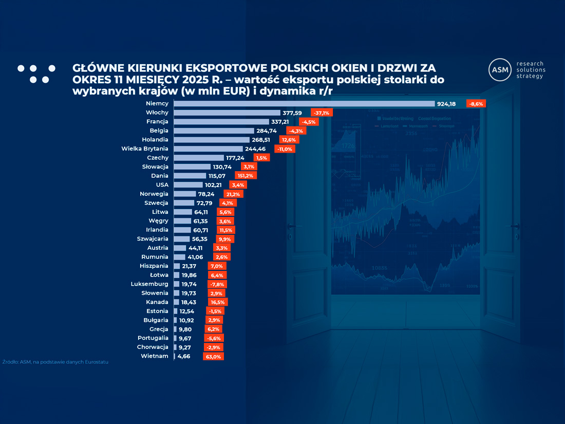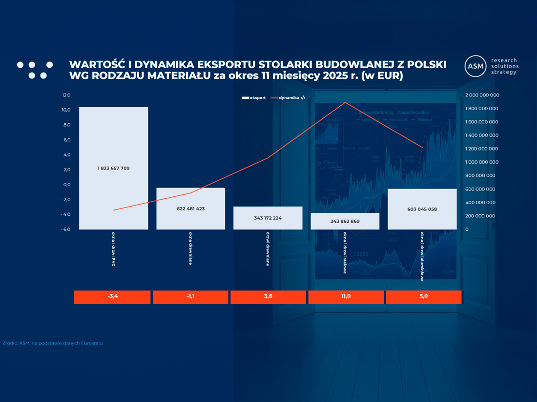 Polski eksport stolarki budowlanej od lat stanowi jeden z najważniejszych segmentów krajowego przemysłu. Najnowsza analiza ASM Research Solutions Strategy (na podstawie danych Eurostatu), za okres 11 miesięcy 2025 r., ujawnia jednak, że sektor ten przestał rozwijać się w sposób jednolity. Zamiast jednego, wyraźnego trendu, widać dziś duże zróżnicowanie. Jedne grupy produktów i kierunki sprzedaży radzą sobie bardzo dobrze, podczas gdy inne wyraźnie zwalniają.